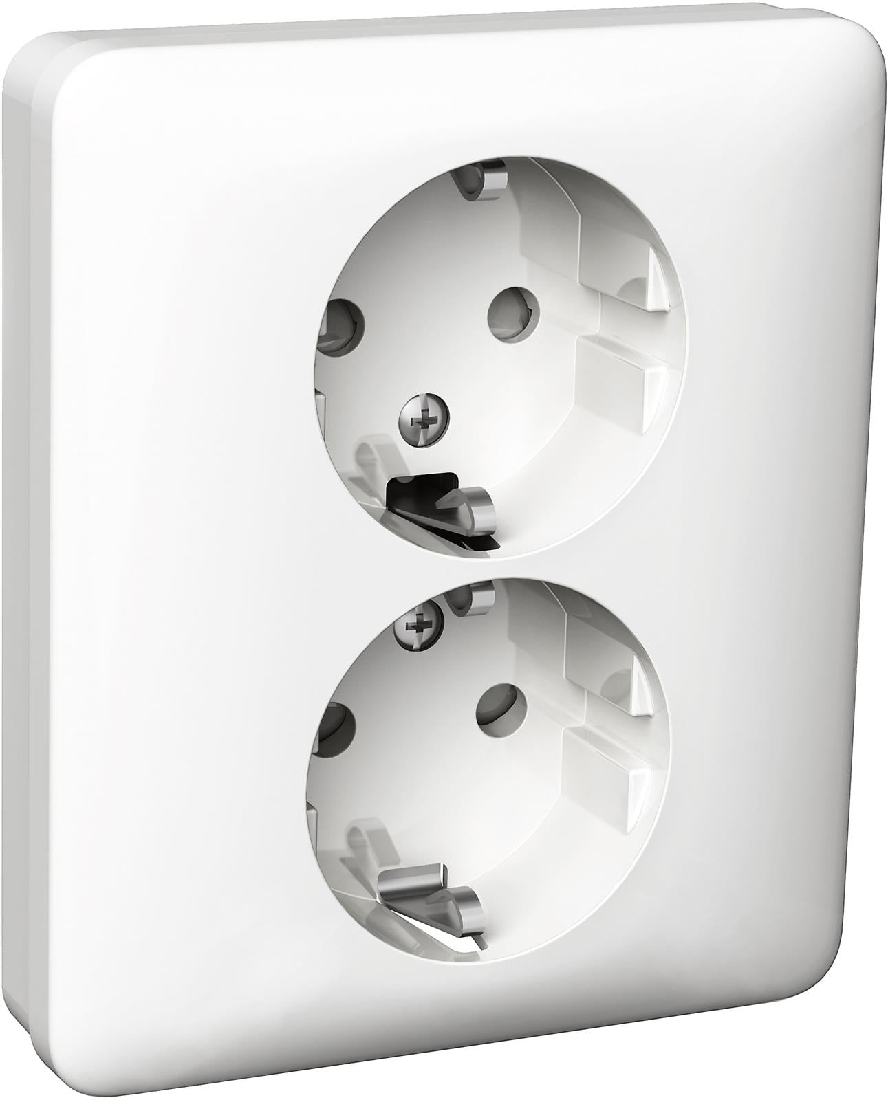 Exxact 2-vägsuttag, Primo med både skruv och snabbanslutning, jordat, petskyddat för infälld montering i apparatdosa c/c 60mm. Inkl fästklor. För utanpåliggande montage används dosa 22mm. Med två neutrala överkopplingsklämmor. Vit