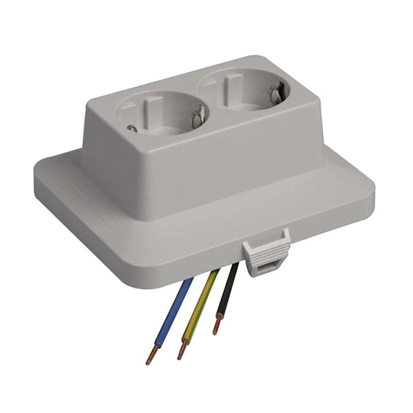 Lock med integrerade Schuko vägguttag 2-vägs. Petskyddat och förkopplade med 2,5 mm2 EK. Lock med integrerade Schuko vägguttag 2-vägs och 4-vägs. Petskyddade och förkopplade med 2,5 mm2 EK.