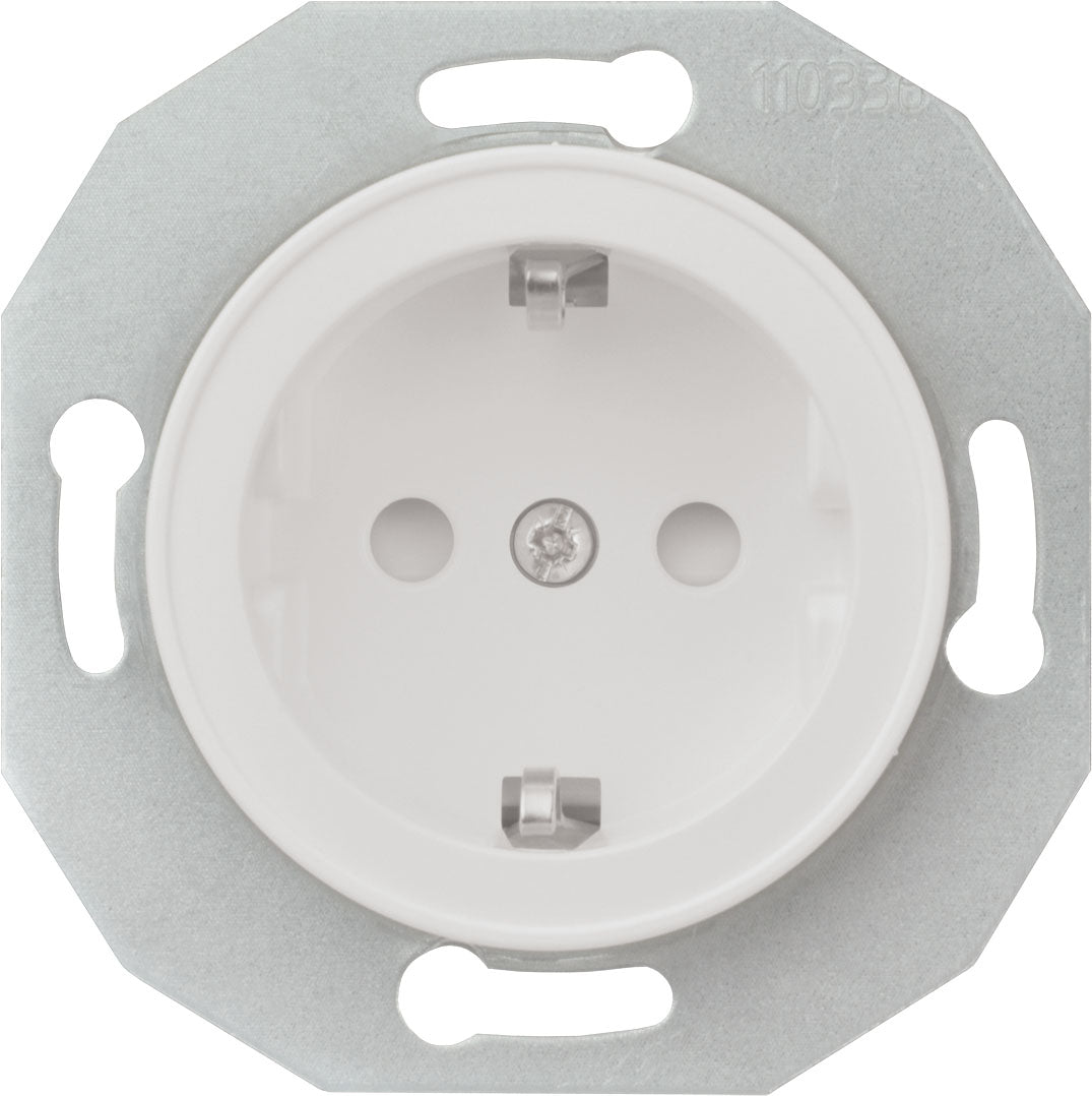 Renova Vägguttag 1-vägs jordat 16A 230V för infällt IP20 montage i apparatdosa inkl fästklor. För utanpåliggande montage används dosa E18 311 96/97. Snabbanslutning, kompletteras med valfri Renova ram. Vit