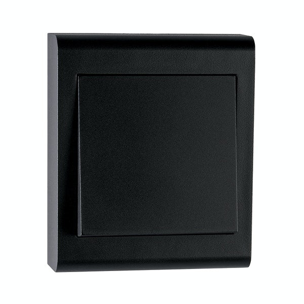 Strömställare Kors utanpåliggande Svart 16A 250V IP21. Utanpåliggande kors strömställare med sockel, vippa och ram i halogenfri och färgbeständig polykarbonat. Används där man önskar slå av/på vid tre olika ställen t.ex. tre olika våningsplan. Färgmärkt snabbkoppling för snabb och enkel installationen.