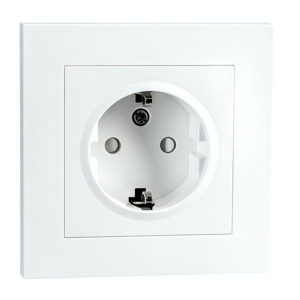 Infällt 1-vägsuttag med jord och integrerat petskydd. Sockel, täckplatta och ram av halogenfri och färgbeständig polykarbonat. Kan användas tillsammans med våra flerfacksramar eller förhöjningsramar för utanpåliggande montage. Färgmärkt snabbkoppling för snabb och enkel installationen.