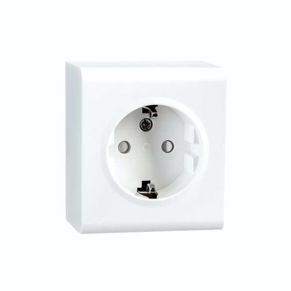 Uttag 1-vägs jordat utanpåliggande Vit 16A 250V IP21. Utanpåliggande 1-vägsuttag med jord och integrerat petskydd. Sockel, täckplatta och ram av halogenfri och färgbeständig polykarbonat. Färgmärkt snabbkoppling för snabb och enkel installationen.