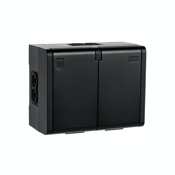 Utanpåliggande 2-vägs uttag IP44 för bruk både utomhus och inomhus, med integrerat petskydd och fällbart lock. Tillverkad av halogenfritt polykarbonat som ger ökad färgbeständig färg. Den revolutionerande kopplingstekniken med öppningsbara snabbklämmor gör att det går snabbt och effektivt att montera.