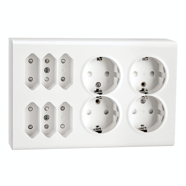 Uttag 4-vägs jordat + 6-Euro utanpåliggande Vit 16A 250V IP21. Utanpåliggande 4-vägsuttag med jord och integrerat petskydd,och 6-vägs Euro med integrerat petskydd. Sockel, täckplatta och ram av halogenfri och färgbeständig polykarbonat. Färgmärkt snabbkoppling för snabb och enkel installationen.