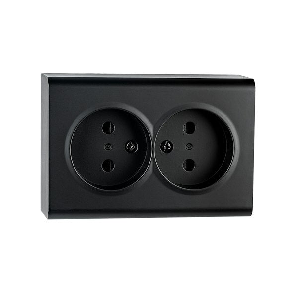 Utanpåliggande 2-vägsuttag utan jord. Sockel, täckplatta och ram av halogenfri och färgbeständig polykarbonat. Färgmärkt snabbkoppling för snabb och enkel installation.