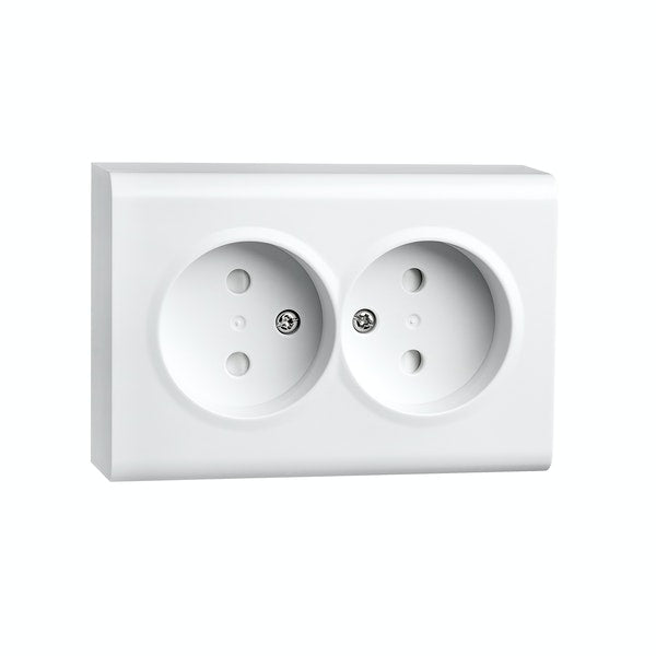 Utanpåliggande 2-vägsuttag utan jord. Sockel, täckplatta och ram av halogenfri och färgbeständig polykarbonat. Färgmärkt snabbkoppling för snabb och enkel installation.